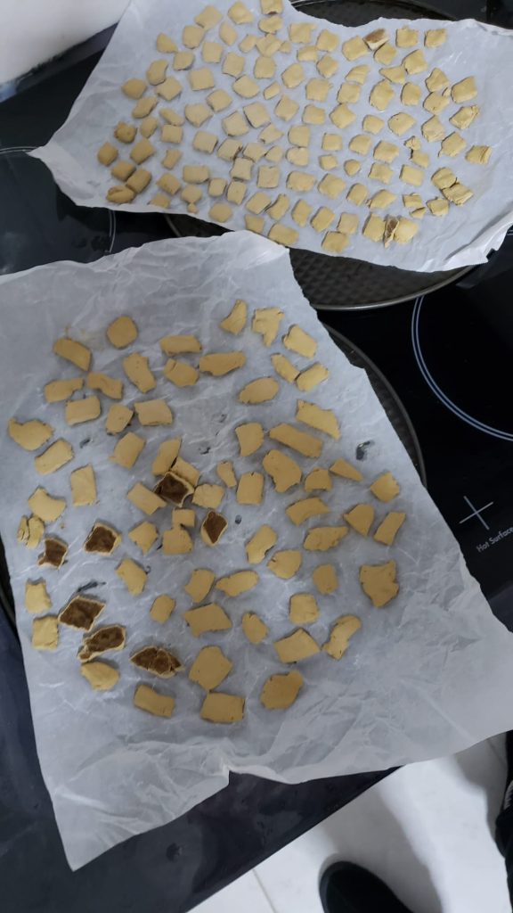 - Put squares on a lined baking tray and bake for about 10 minutes. You will know they are done when they are a little golden but not too hard.