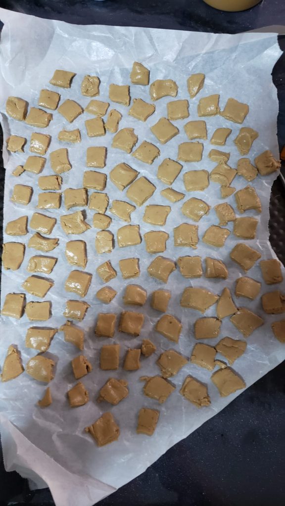 - Flatten the mixture onto a surface like you’re making cookies, and cut into small squares.
