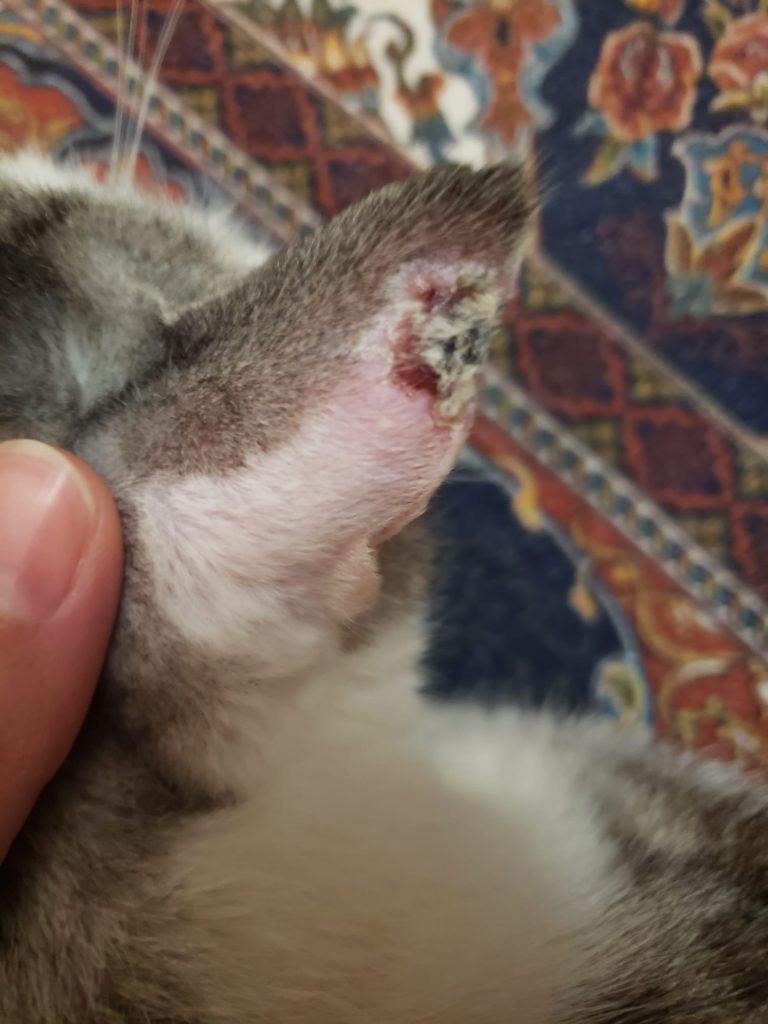 After the second session, he recovered well, though the zap to the ear and nose proved particularly painful for him. His face was extremely swollen, more than the first session, and his ear was very scabbed. The swelling did go down after a couple weeks and he was starting to be more himself again. About 3 weeks later, a part of his ear fell off where it was zapped. Not to worry, it just scabbed and fell off. I’m not worried about it, it didn’t seem to bother him either after the swelling went down. His ear is better off without the cancerous part.